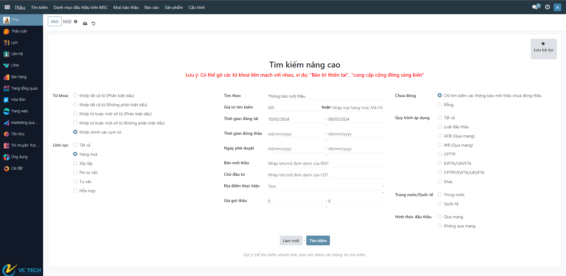 thông tin về các gói thầu phù hợp với nhu cầu của doanh nghiệp từ hệ thống
